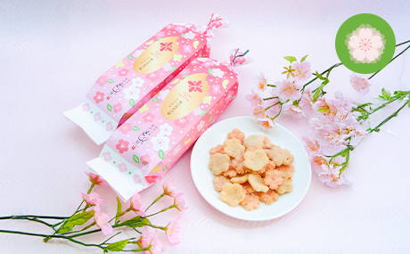 可愛らしい桜の花形の揚げおかき。外袋は春限定パッケージです。